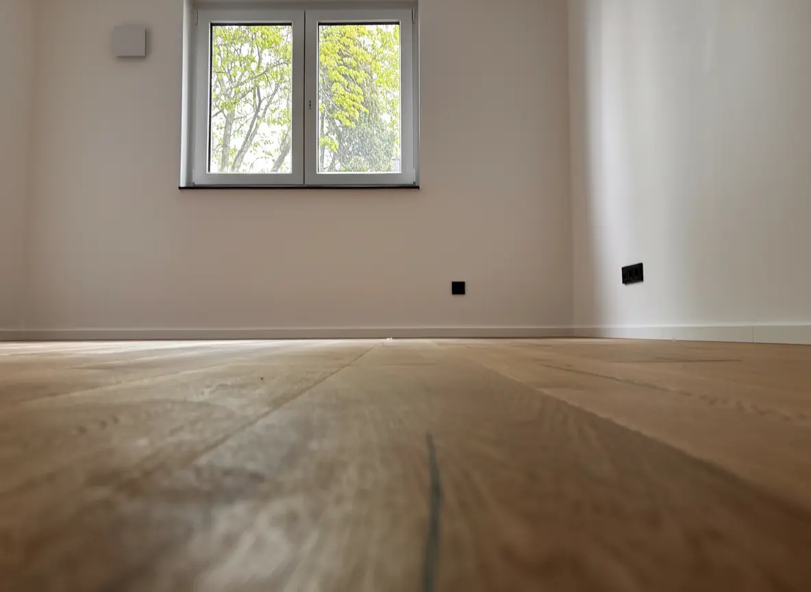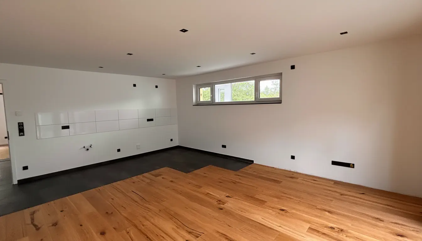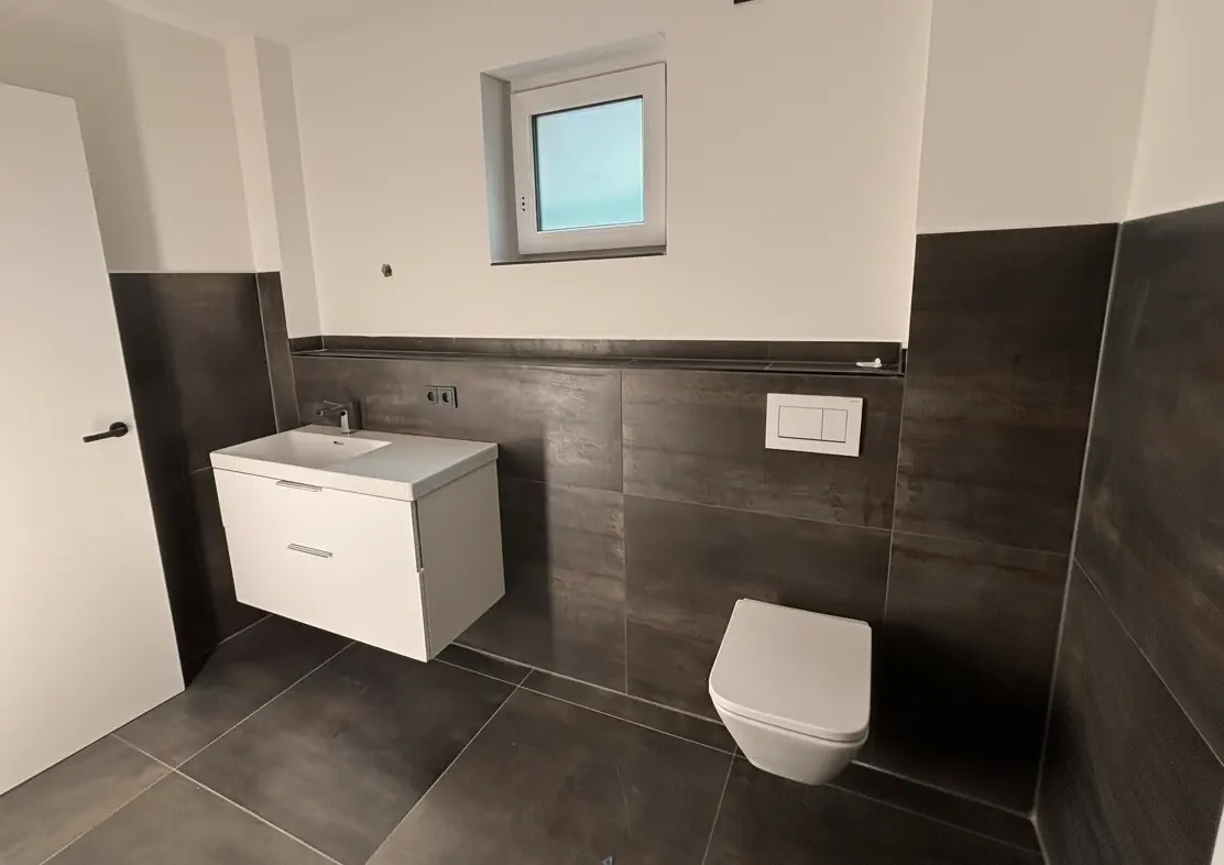 Wohnung 3 liegt im Erdgeschoss links. Sie hat zwei Schlafzimmer, ein Wohnzimmer mit offener Küche, ein Badezimmer mit Dusche (Regendusche), Handtuchheizung, WC und Waschtisch. Der Boden in den Wohnräumen ist mit Eiche-Parkett ausgelegt, in den Nassbereichen mit hochwertigen Fliesen im Großformat 80×80 cm. Alle Räume haben eine kontrollierte Wohnraumlüftung dezentral mit Wärmerückgewinnung, Fußbodenheizung für Heizen und passives Kühlen, integrierte Deckenspots LED (im WZ/EZ/KÜ dimmbar) sowie Türbeschläge und Schalter in schwarz. Die 3-fach isolierverglasten Fenster sind mit elektrischen Rollladen ausgestattet.